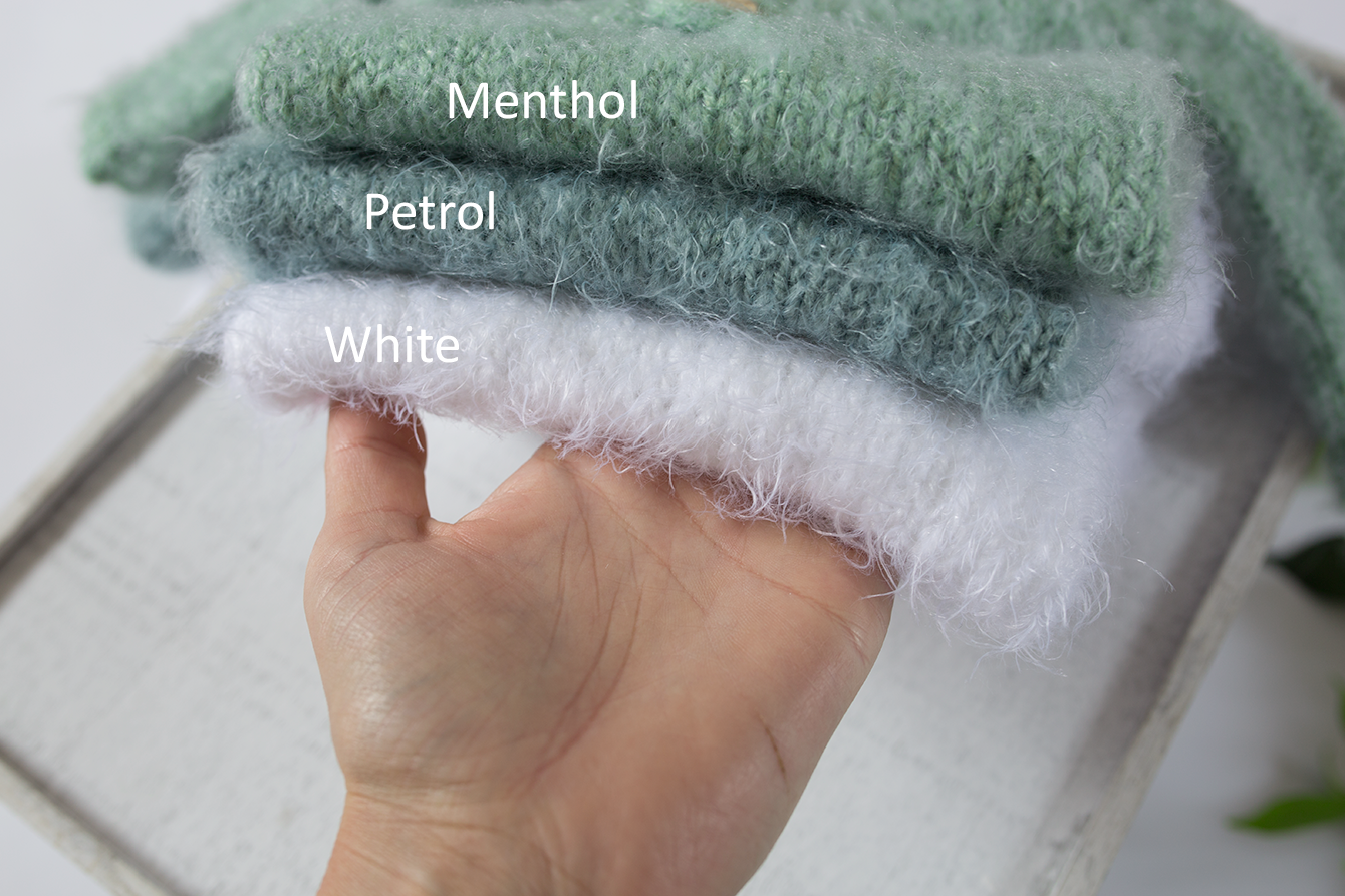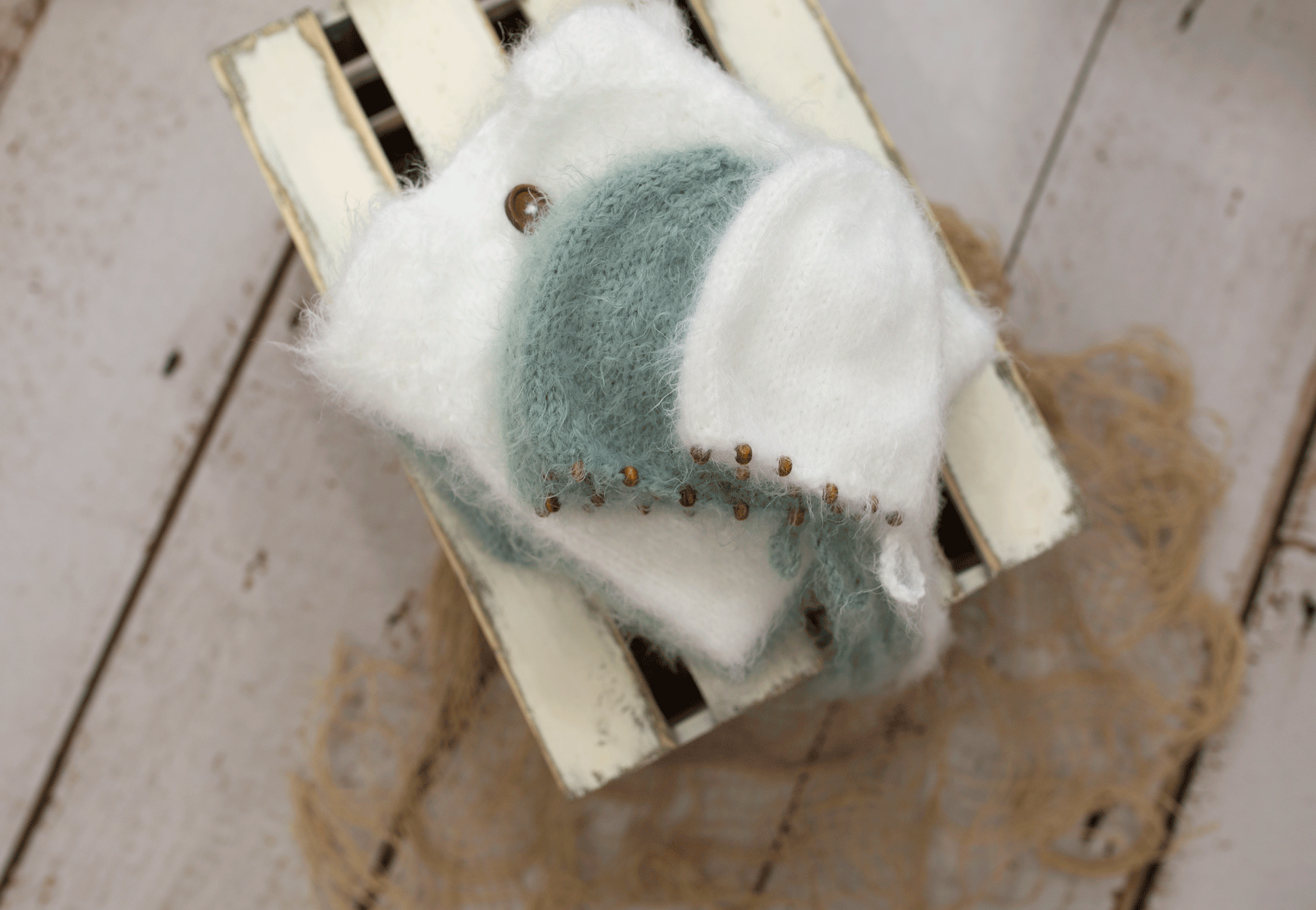 Knitted newborn size pyjama, beaded bonnet, petrol,white, menthol, READY TO SEND