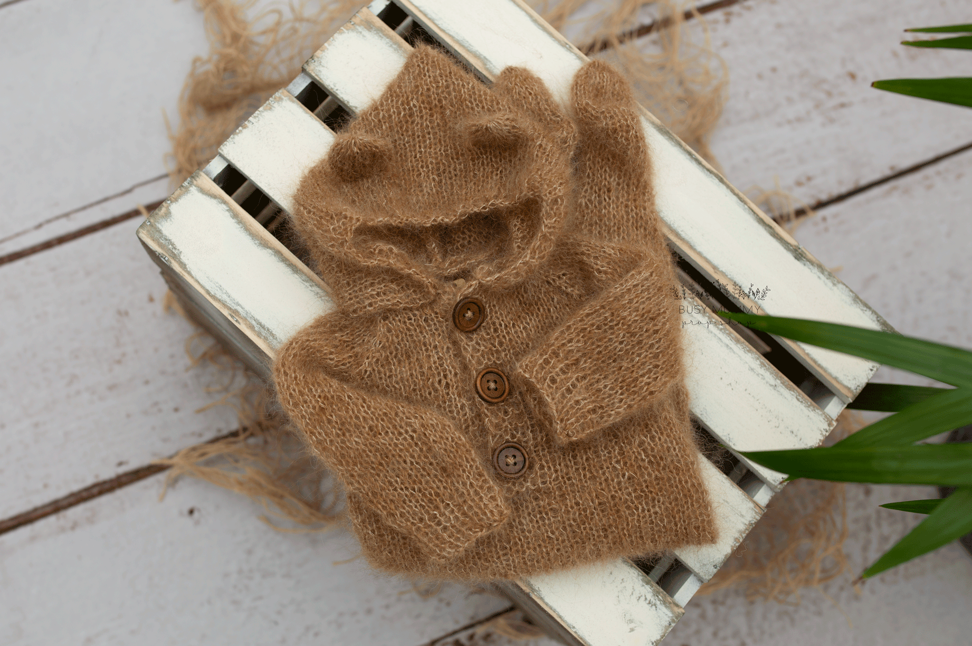 Newborn knitted bear set, brown, pyjama, hood, READY TO SEND