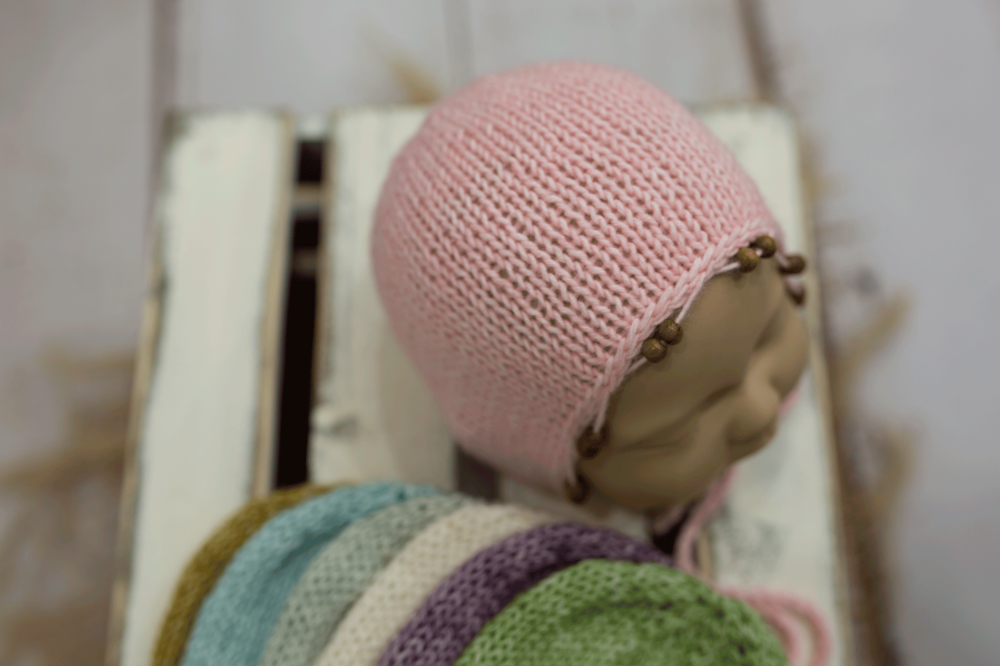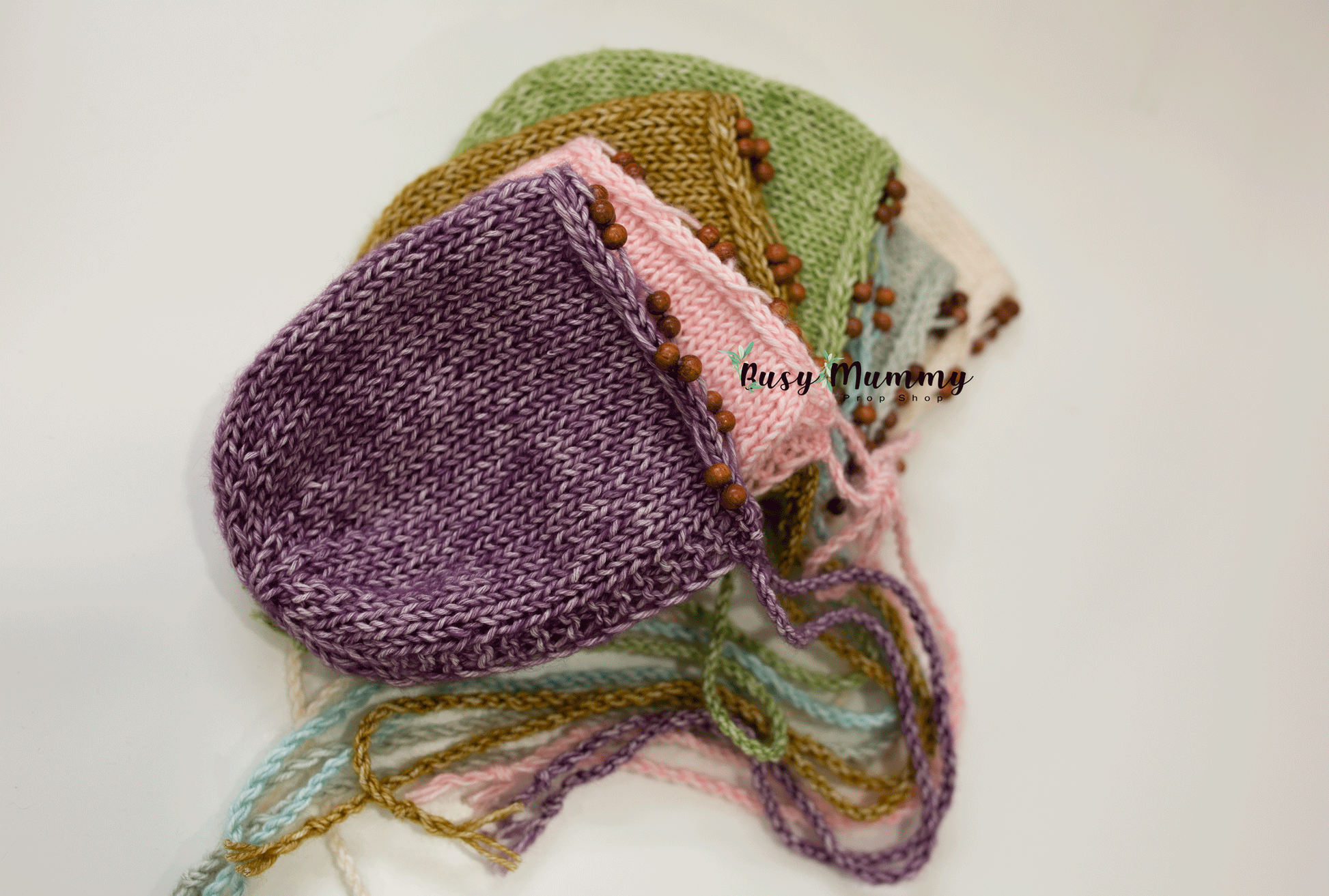 Newborn knitted bonnet, beaded , pink, green, off white, READY TO SEND