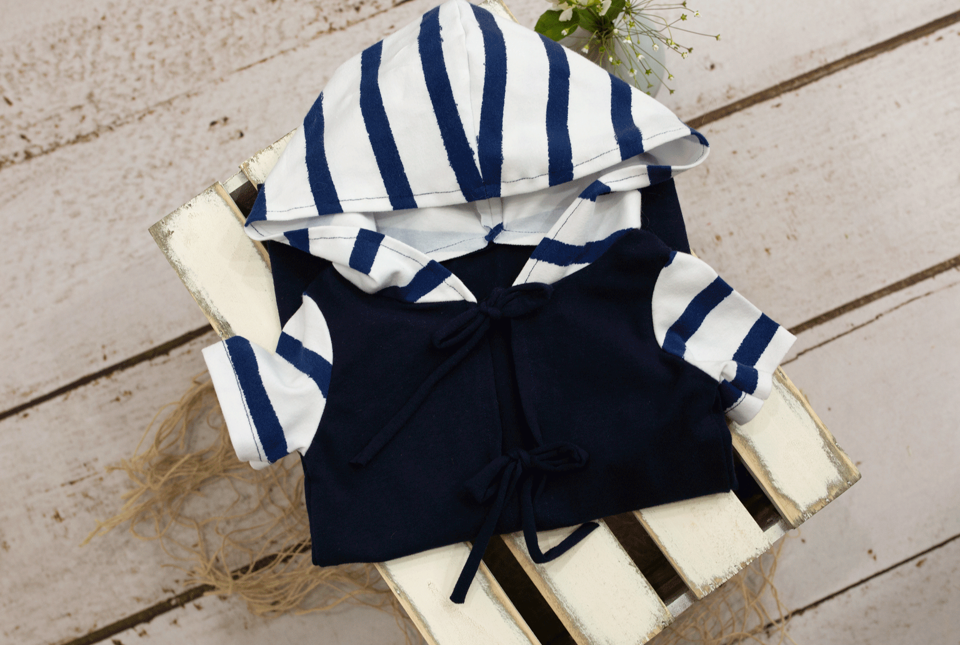 Sitter size, navy blue, stripe, romper, hood, Ready to send